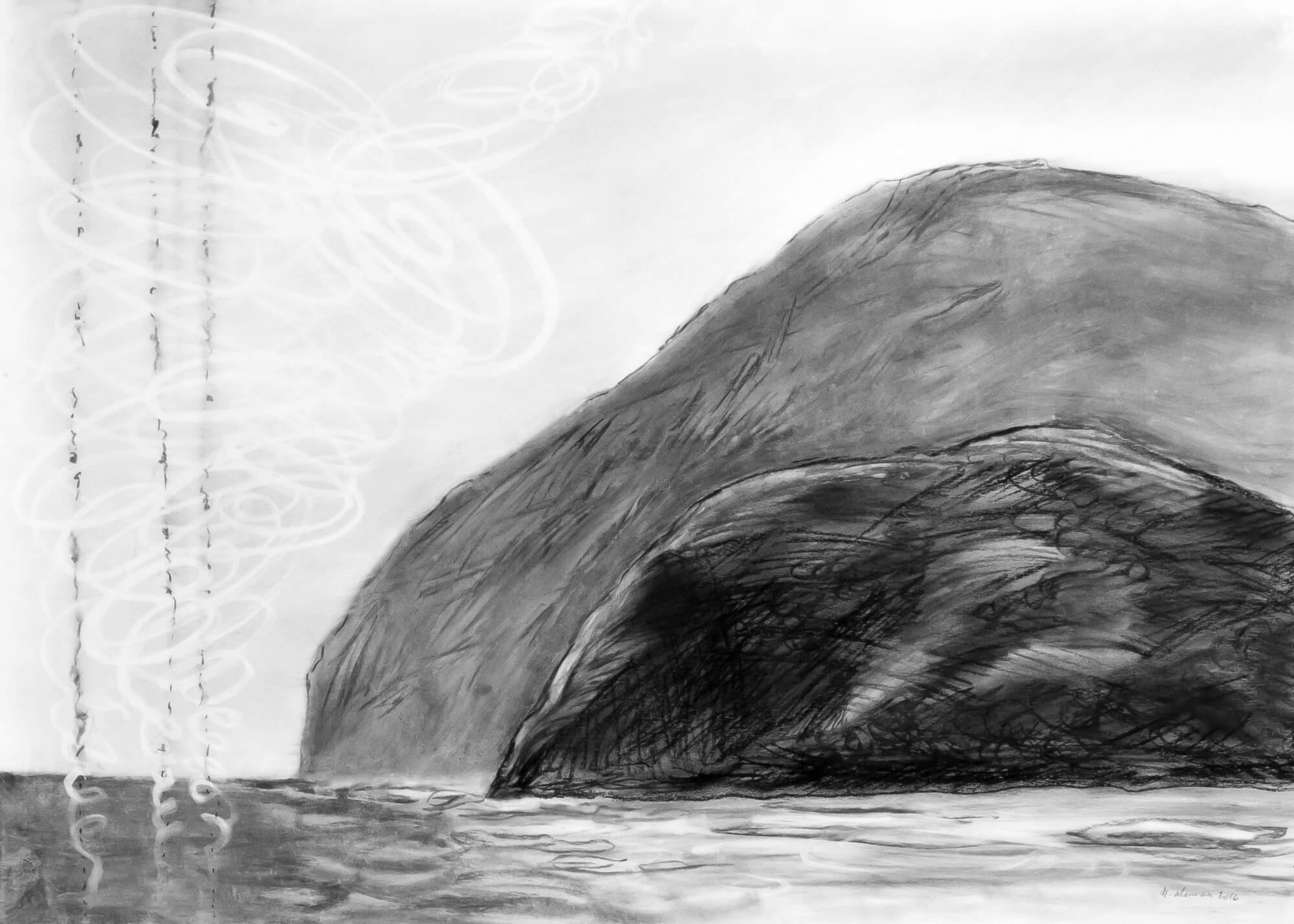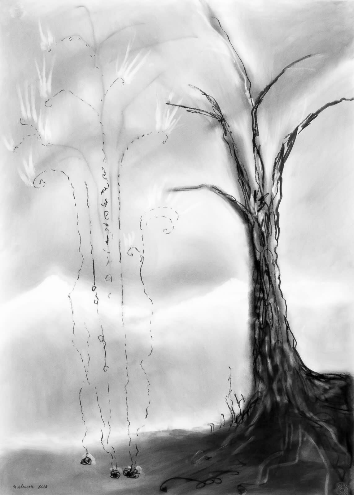 Axis Mundi (2016) consists of charcoal drawings made in direct connection with a hypnagogic state of mind reached by Active Imagination, a method founded by the Swiss psychoanalyst Carl Gustav Jung. The drawings were shown in exhibitions in Kunming, Beijing, Stockholm and Malmö.