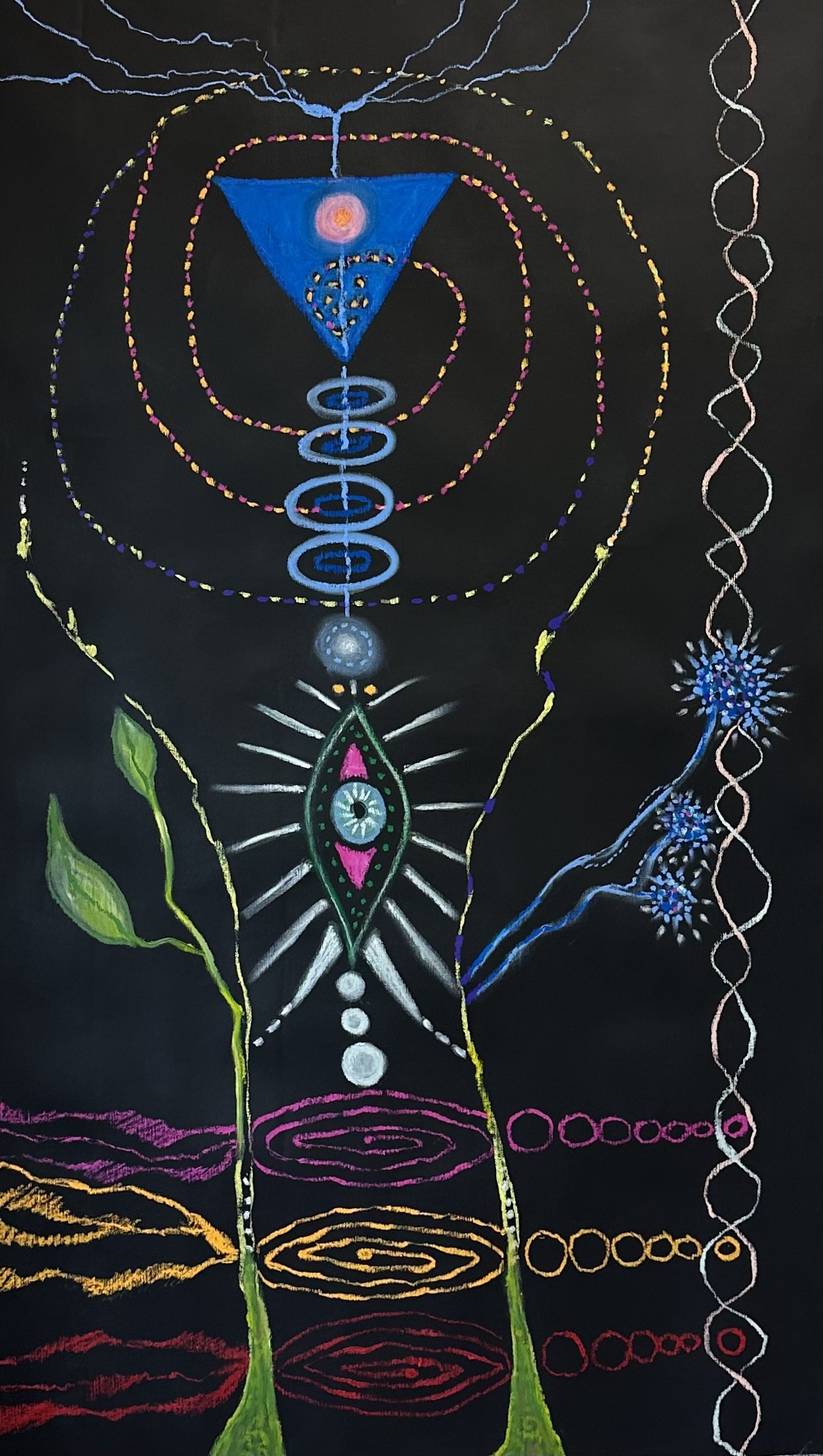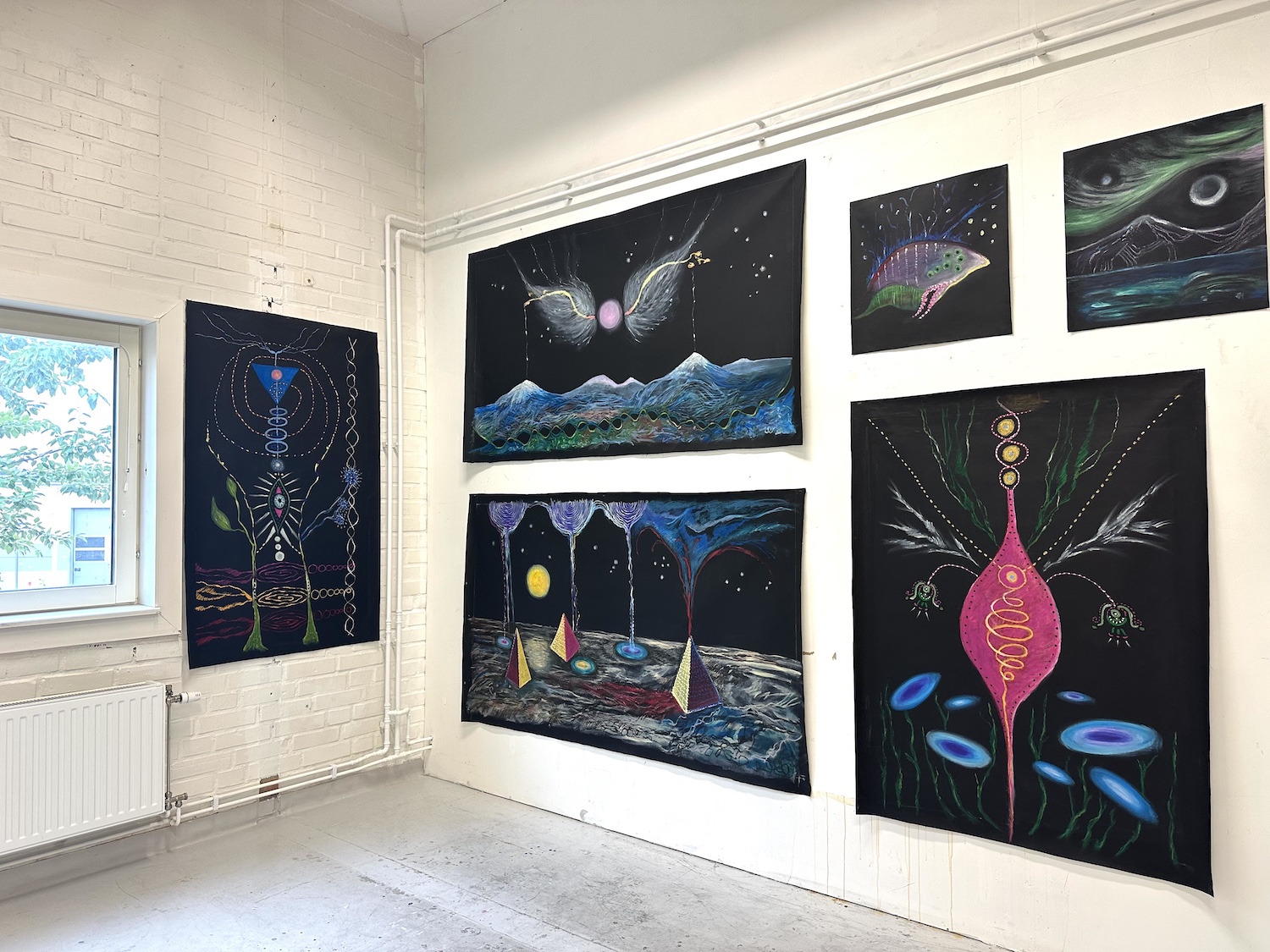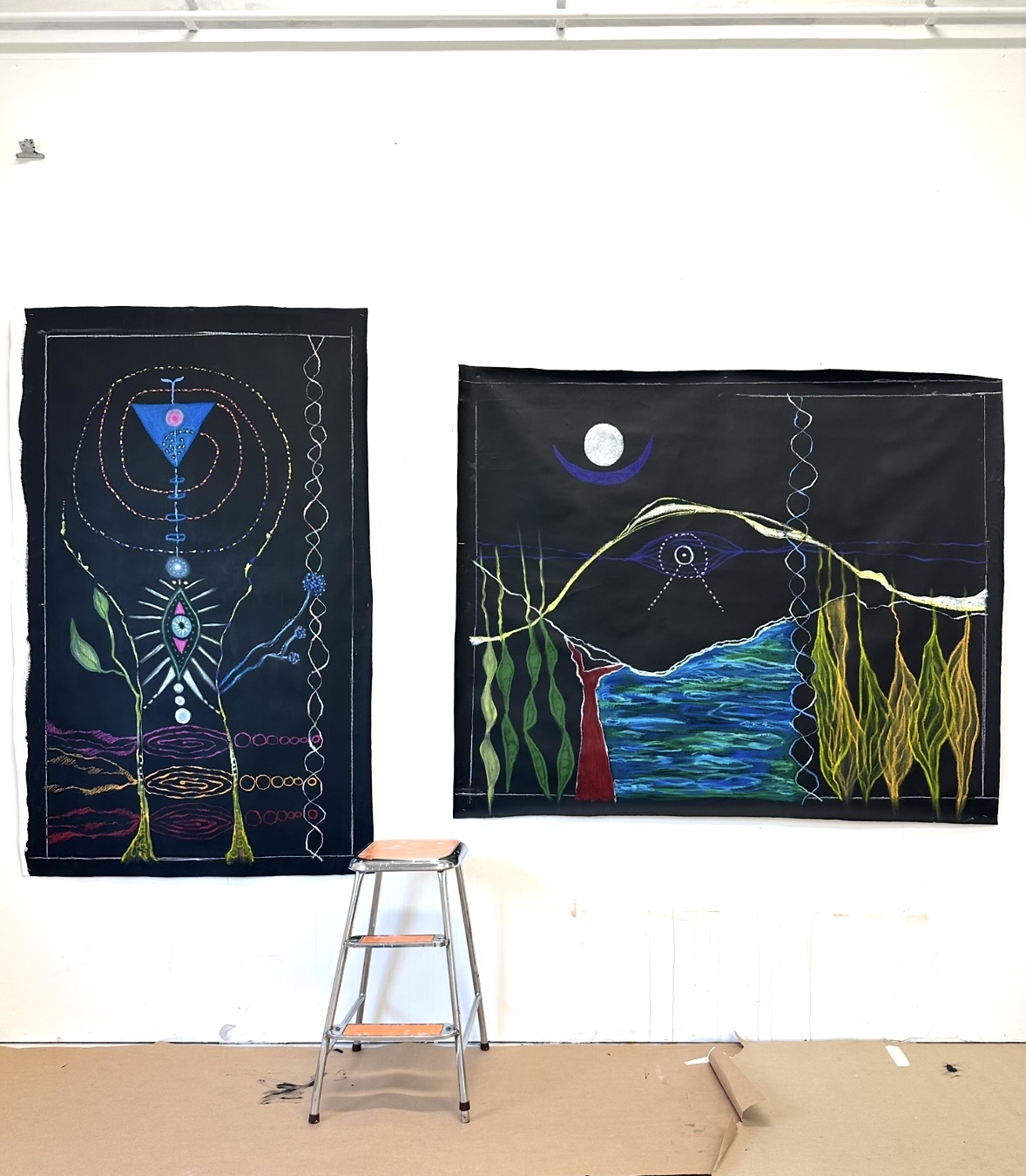 Journey IV are works inspired by astrological studies. Every week, during 2025 I followed the astrological forecast, practiced rituals at Full Moons and New Moons and brought the events with me in Active Imagination. After inner journeying I drew either oil on linen or sketches in my black Astro Diary.